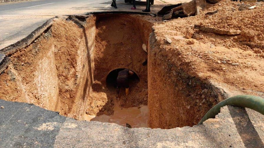 EL CORREO. Una ruptura de una tubería de agua de 48 pulgadas causó un socavón en la avenida San Vicente de Paúl esquina Presidente Vásquez en el sector de Alma Rosa al momento de poner a prueba una nueva válvula cerca del lugar.
