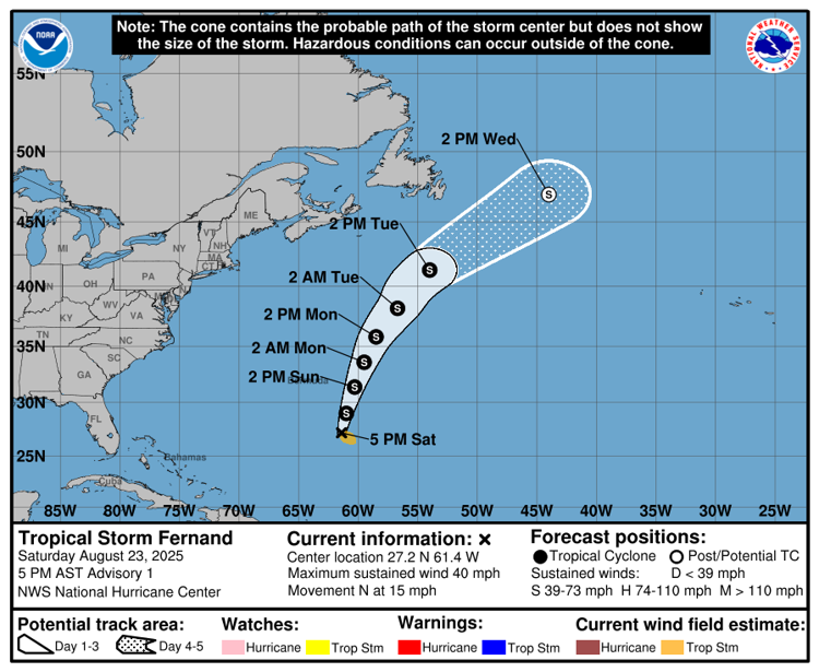 El Centro Nacional de Huracanes (NHC) de Estados Unidos informó este sábado sobre la formación de la tormenta tropical Fernand, localizada a unos 665 kilómetros al sur de las islas Bermudas.